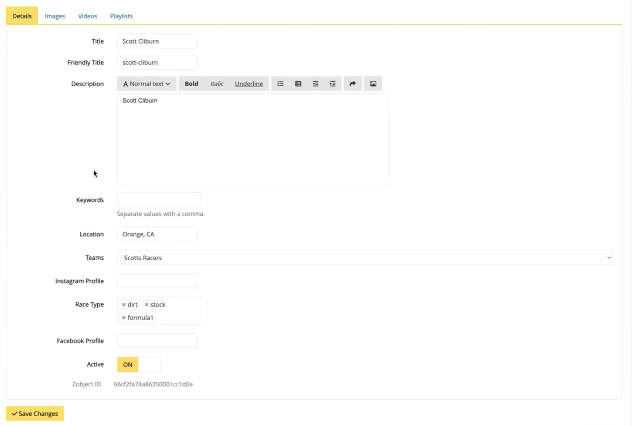 To edit an existing Zobject record, click on the record to expand the Details page for that Zobject. There you’ll see any custom fields you’ve created (Such as Instagram Profile, Race Type, Facebook Profile etc), or any fields you’ve chosen to automatically associate with each and every Zobject record (Such as Title, Description, Keywords, etc).